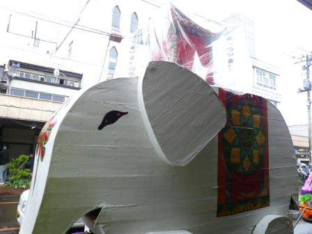 市中パレードに太鼓や象さんを引っ張ったりします。